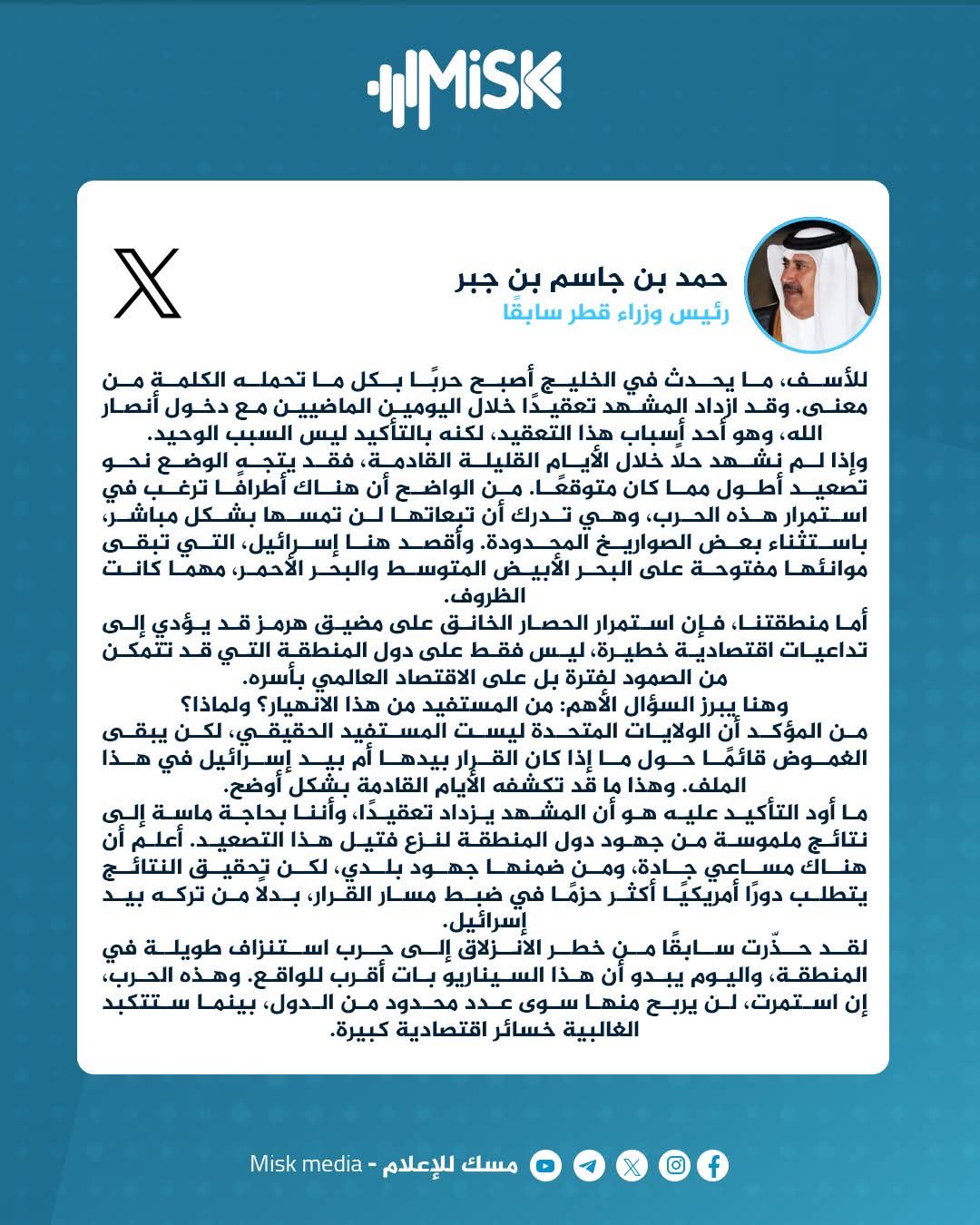 غرد رئيس وزراء قطر سابقًا حمد بن جاسم بن جبر عبر أكس :
